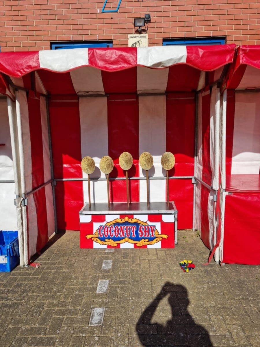 🥥 Coconut Shy Stall Setup – complete with coconuts, stands, and throwing balls.