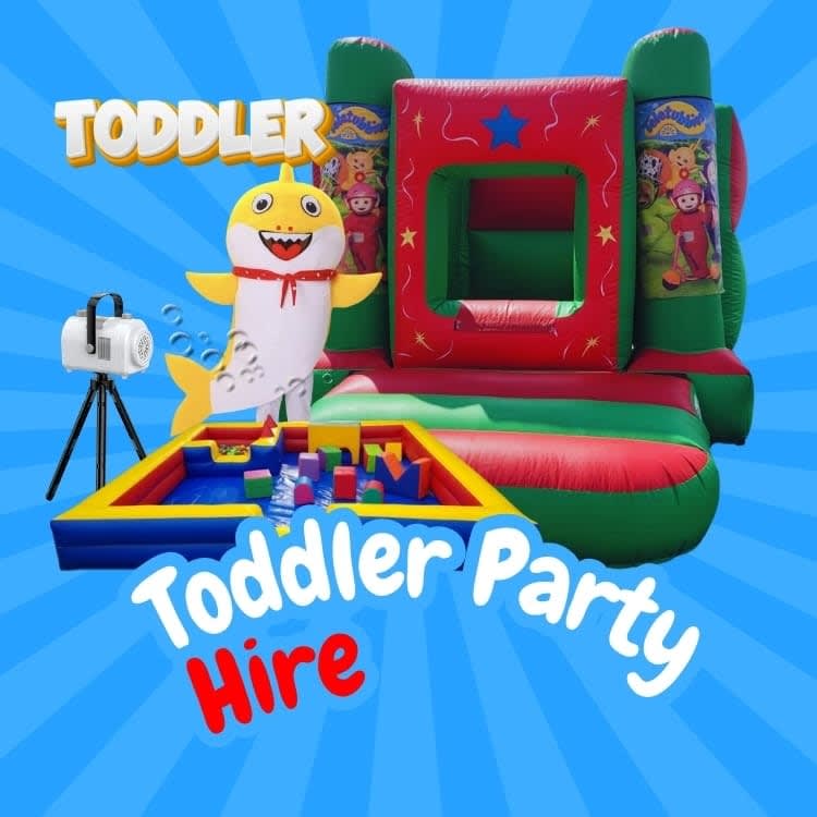Baby Shark Toddler Self-Hire Party Package Gloucestershire & Bristol — includes toddler bouncy castle, bubble machine, mascot costume, soft play park & ball pool. Perfect for birthdays & events across Gloucestershire & Bristol.